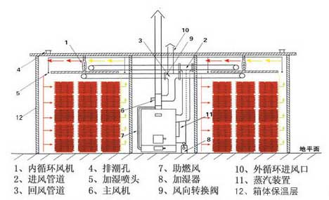 熱風(fēng)式烘干機(jī)工作原理是利用燃燒產(chǎn)生的熱能,加熱窯內(nèi)的空氣,由熱風(fēng)爐頂部主風(fēng)機(jī)將窯內(nèi)的空氣通過(guò)管道吸入爐體,將空氣加熱。再通過(guò)管道,送入窯內(nèi),由窯內(nèi)的循環(huán)風(fēng)機(jī)不斷的循環(huán)對(duì)窯內(nèi)的木材均勻加熱。木材烘干過(guò)程中如需要蒸汽,可由熱風(fēng)爐內(nèi)的蒸汽發(fā)生器提供,如果是一爐兩房時(shí),管道上裝有插閥,通過(guò)插閥的調(diào)節(jié)來(lái)控制窯內(nèi)的溫度。在烘干的過(guò)程中,由于木材要進(jìn)行排濕,在窯頂上留有排濕孔。